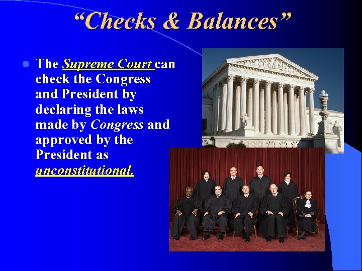 “Checks & Balances” l The Supreme Court can check the Congress and President by declaring the laws made by Congress and approved by the President as unconstitutional.