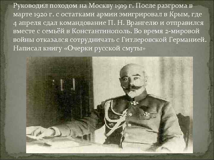 Руководил походом на Москву 1919 г. После разгрома в марте 1920 г. с остатками армии эмигрировал в Крым, где 4 апреля сдал командование П. Н. Врангелю и отправился вместе с семьёй в Константинополь. Во время 2 -мировой войны отказался сотрудничать с Гитлеровской Германией. Написал книгу «Очерки русской смуты»