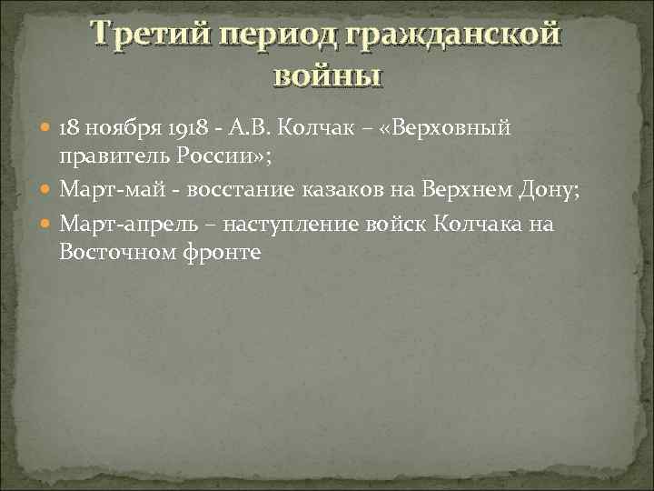 Третий период гражданской войны 18 ноября 1918 - А. В. Колчак – «Верховный правитель России» ; Март-май - восстание казаков на Верхнем Дону; Март-апрель – наступление войск Колчака на Восточном фронте