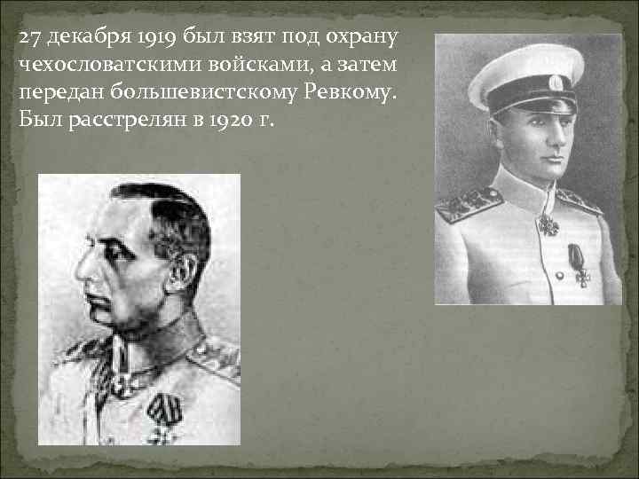 27 декабря 1919 был взят под охрану чехословатскими войсками, а затем передан большевистскому Ревкому. Был расстрелян в 1920 г.