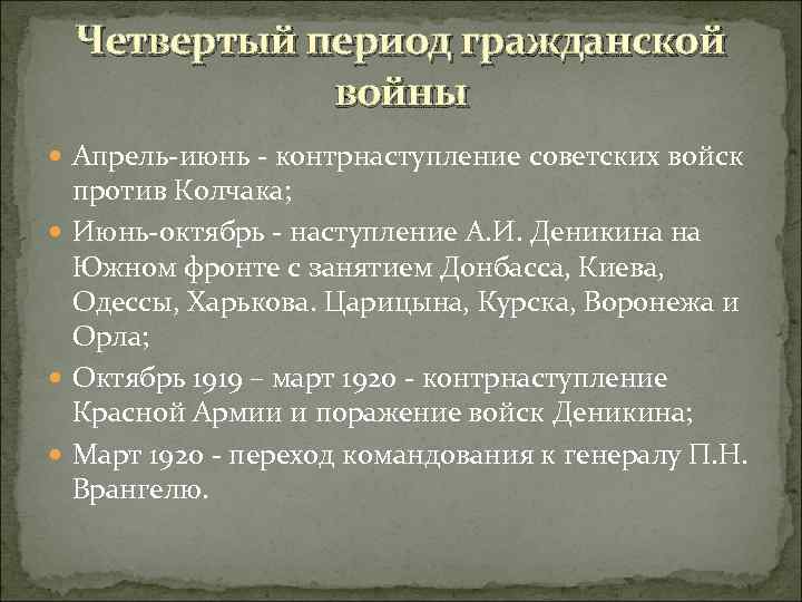 Четвертый период гражданской войны Апрель-июнь - контрнаступление советских войск против Колчака; Июнь-октябрь - наступление А. И. Деникина на Южном фронте с занятием Донбасса, Киева, Одессы, Харькова. Царицына, Курска, Воронежа и Орла; Октябрь 1919 – март 1920 - контрнаступление Красной Армии и поражение войск Деникина; Март 1920 - переход командования к генералу П. Н. Врангелю.