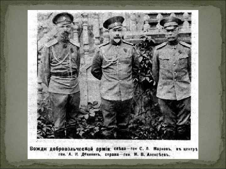 Деникин Антон Иванович 1872 - 1947 Генерал – Лейтенант, участник 1 -мировой войны. В 1917 командовал Западным и Юго-западным фронтами. За участие в Корниловском мятеже арестован. Бежал на Дон, где стал одним из организаторов Добровольческой армии. Прозвище – «Царь Антон»