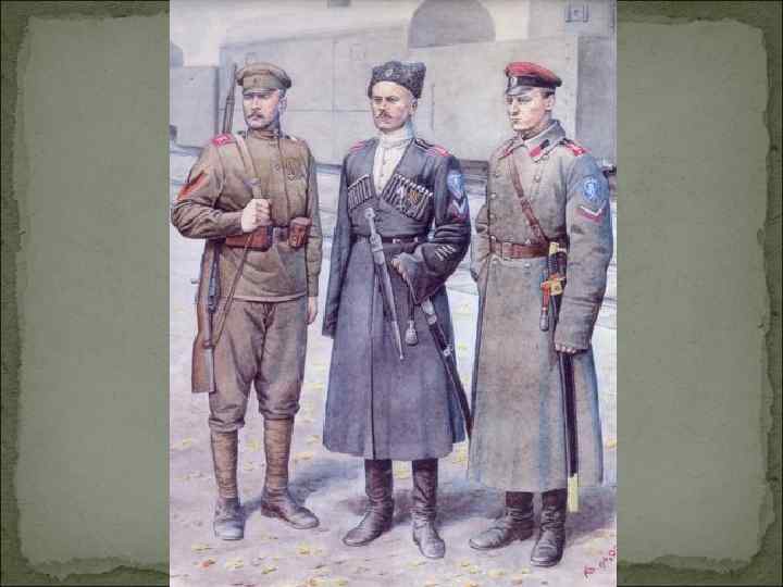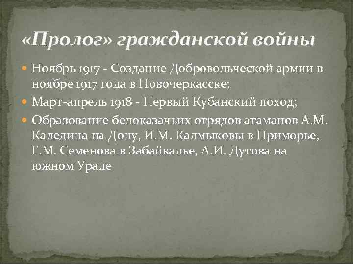«Пролог» гражданской войны Ноябрь 1917 - Создание Добровольческой армии в ноябре 1917 года в Новочеркасске; Март-апрель 1918 - Первый Кубанский поход; Образование белоказачьих отрядов атаманов А. М. Каледина на Дону, И. М. Калмыковы в Приморье, Г. М. Семенова в Забайкалье, А. И. Дутова на южном Урале