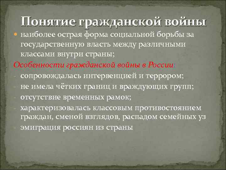 Понятие гражданской войны наиболее острая форма социальной борьбы за государственную власть между различными классами внутри страны; Особенности гражданской войны в России: - сопровождалась интервенцией и террором; - не имела чётких границ и враждующих групп; - отсутствие временных рамок; - характеризовалась классовым противостоянием граждан, сменой взглядов, распадом семейных уз - эмиграция россиян из страны