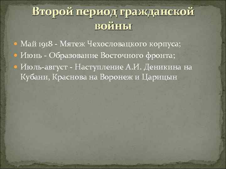 Второй период гражданской войны Май 1918 - Мятеж Чехословацкого корпуса; Июнь - Образование Восточного фронта; Июль-август - Наступление А. И. Деникина на Кубани, Краснова на Воронеж и Царицын