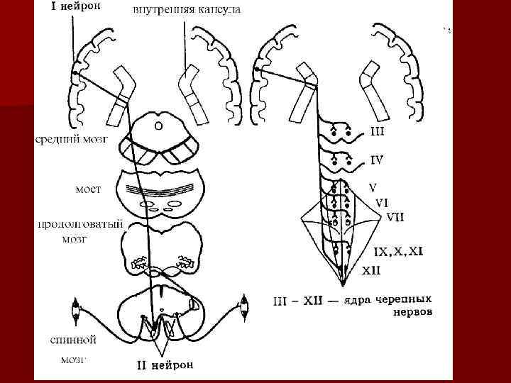 Колено образовано корково-ядерным путем, соединяющим кору с двигательными ядрами черепно -мозговых нервов от III до XII пар.