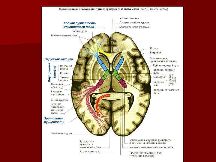 Проекционные волокна связывают кору большого мозга с нижележащими отделами как головного, так и спинного мозга. При и этом выделяют выходящие и нисходящие волокна. Проекционные волокна, находящиеся ближе всего к коре, образуют лучистый венец. Все они затем сходятся во внутреннюю капсулу