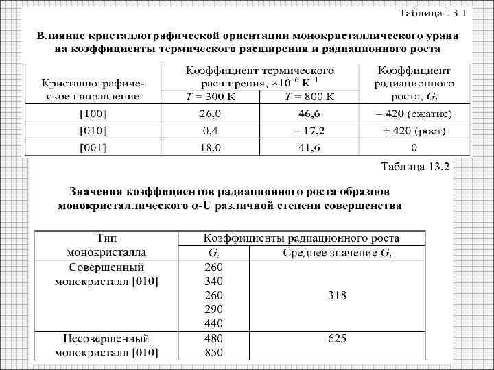 Описание радиационного роста Явление радиационного роста количественно характеризуется коэффициентом радиационного роста Gi – безразмерной величиной, представляющей собой относительное удлинение образца за одно деление атома урана где - отношение числа атомов (Δn), испытавших деление, к общему числу (n) атомов, l и l 0 – конечная и исходная длина образца. В тех случаях, когда изменения длины образца малы, может применяться следующее приближенное выражение Коэффициенты радиационного роста Gi для образцов монокристаллического α-U различной ориентации, облученных при нормальной температуре, имеют примерные значения, приведенные в табл. 13. 1. Однако рост монокристаллов урана различной степени совершенства также различен: чем выше степень совершенства монокристалла, тем ниже коэффициент радиационного роста (табл. 13. 2).