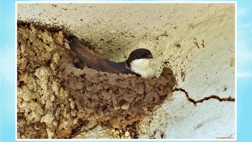Ласточка строит свое гнездо из комочков сырой земли. Землю она находит в лужах, скатывает в шарики, приносит их в клюве к месту постройки и прочно прикрепляет к сте не, склеивая собственной слюной. Деревенская ласточка для прочности сооружения примешивает к земле соломинки, стебельки, конский волос.