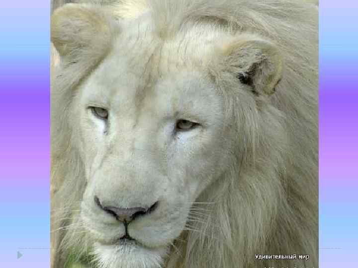 Заключение Мы поняли как белые львы стали вымирающими животными и как они выглядят. Если программа по развитию этих прекрасных и благородных зверей продолжится, то когда-нибудь их будет достаточно много, и они перестанут, находиться на грани вымирания. Мы искренно на то надеемся, ведь когда-то их было всего 3, а сейчас их количество возросло в 100 раз.