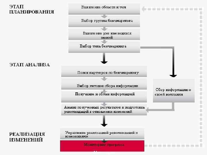 Бенчмаркинг – это современный метод менеджмента, с помощью которого организация сравнивает собственную работу с практикой других компаний с целью проведения изменений, улучшения деятельности, повышения конкурентоспособности. 1 1 Бенчмаркетинг: основные понятия и процесс реализации. – 20. 11. 2012 [Электронный ресурс]. – (http: //www. cfin. ru/)