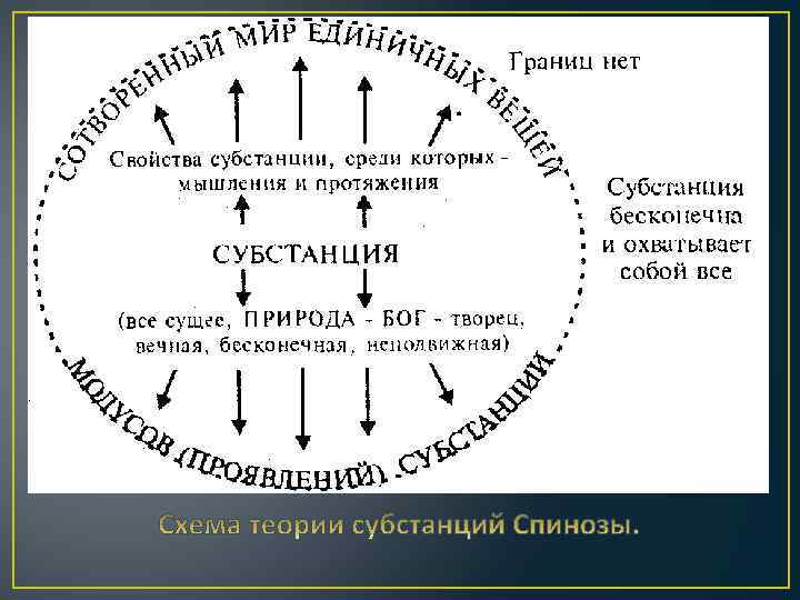 Учение о единой субстанции: • не существует различия между высшей субстанцией — Богом и сотворенными им другими Субстанциями; • существует только одна единая субстанция, которая заключает в себе все сущее; • данная субстанция заключает в себе окружающий мир (Природу) и Бога; • природа и Бог — едины;