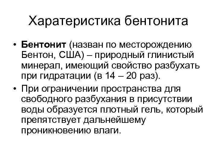 Харатеристика бентонита • Бентонит (назван по месторождению Бентон, США) – природный глинистый минерал, имеющий свойство разбухать при гидратации (в 14 – 20 раз). • При ограничении пространства для свободного разбухания в присутствии воды образуется плотный гель, который препятствует дальнейшему проникновению влаги.