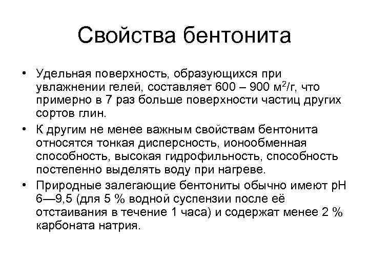 Свойства бентонита • Удельная поверхность, образующихся при увлажнении гелей, составляет 600 – 900 м 2/г, что примерно в 7 раз больше поверхности частиц других сортов глин. • К другим не менее важным свойствам бентонита относятся тонкая дисперсность, ионообменная способность, высокая гидрофильность, способность постепенно выделять воду при нагреве. • Природные залегающие бентониты обычно имеют р. Н 6— 9, 5 (для 5 % водной суспензии после её отстаивания в течение 1 часа) и содержат менее 2 % карбоната натрия.