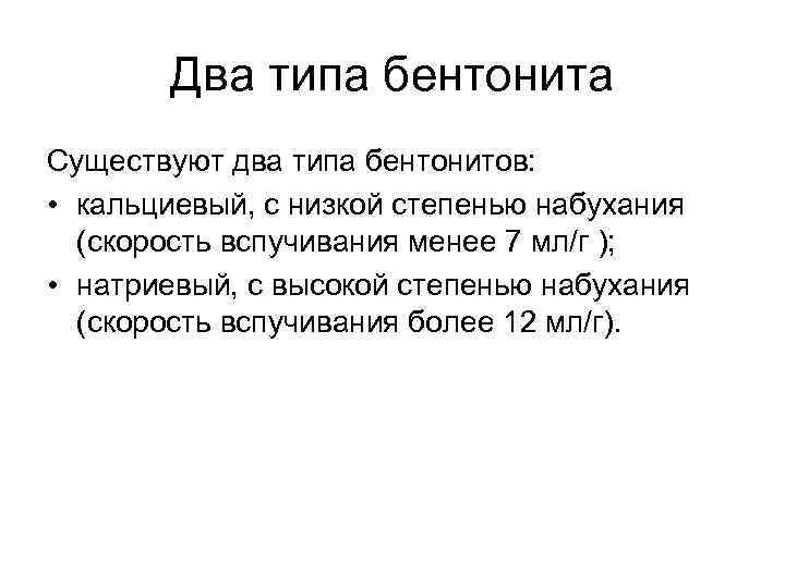 Два типа бентонита Существуют два типа бентонитов: • кальциевый, с низкой степенью набухания (скорость вспучивания менее 7 мл/г ); • натриевый, с высокой степенью набухания (скорость вспучивания более 12 мл/г).