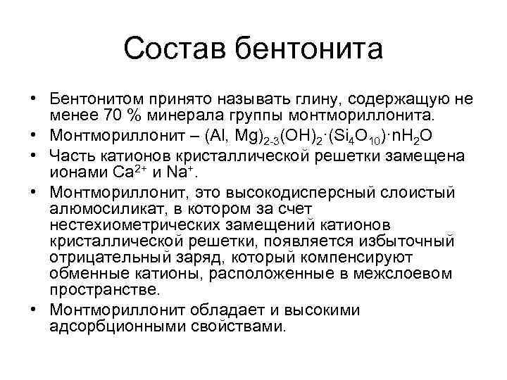 Состав бентонита • Бентонитом принято называть глину, содержащую не менее 70 % минерала группы монтмориллонита. • Монтмориллонит – (Al, Mg)2 -3(OH)2·(Si 4 O 10)·n. H 2 O • Часть катионов кристаллической решетки замещена ионами Ca 2+ и Na+. • Монтмориллонит, это высокодисперсный слоистый алюмосиликат, в котором за счет нестехиометрических замещений катионов кристаллической решетки, появляется избыточный отрицательный заряд, который компенсируют обменные катионы, расположенные в межслоевом пространстве. • Монтмориллонит обладает и высокими адсорбционными свойствами.