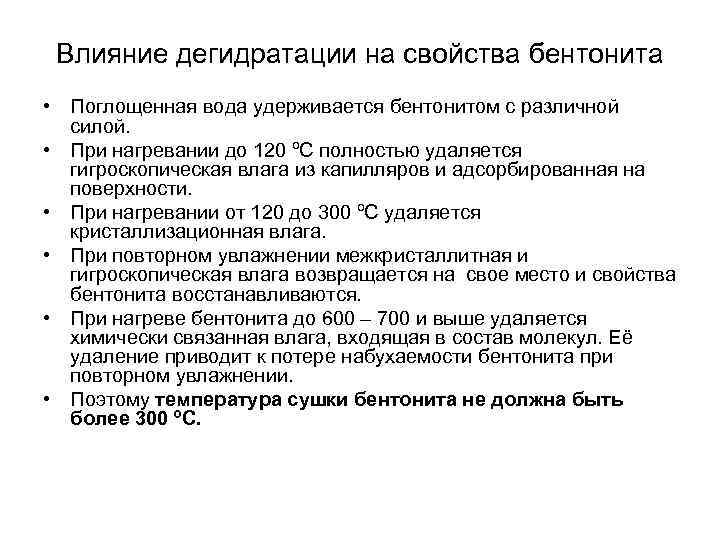 Влияние дегидратации на свойства бентонита • Поглощенная вода удерживается бентонитом с различной силой. • При нагревании до 120 ºС полностью удаляется гигроскопическая влага из капилляров и адсорбированная на поверхности. • При нагревании от 120 до 300 ºС удаляется кристаллизационная влага. • При повторном увлажнении межкристаллитная и гигроскопическая влага возвращается на свое место и свойства бентонита восстанавливаются. • При нагреве бентонита до 600 – 700 и выше удаляется химически связанная влага, входящая в состав молекул. Её удаление приводит к потере набухаемости бентонита при повторном увлажнении. • Поэтому температура сушки бентонита не должна быть более 300 ºС.