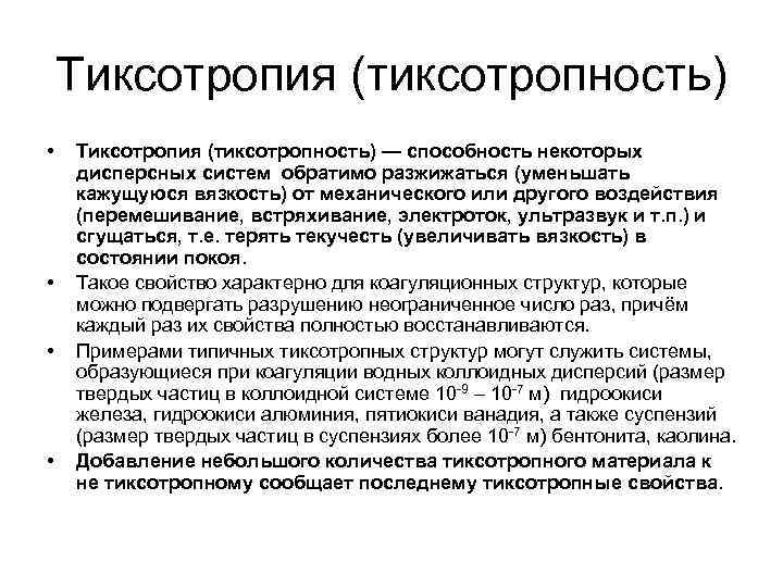 Тиксотропия (тиксотропность) • • Тиксотропия (тиксотропность) — способность некоторых дисперсных систем обратимо разжижаться (уменьшать кажущуюся вязкость) от механического или другого воздействия (перемешивание, встряхивание, электроток, ультразвук и т. п. ) и сгущаться, т. е. терять текучесть (увеличивать вязкость) в состоянии покоя. Такое свойство характерно для коагуляционных структур, которые можно подвергать разрушению неограниченное число раз, причём каждый раз их свойства полностью восстанавливаются. Примерами типичных тиксотропных структур могут служить системы, образующиеся при коагуляции водных коллоидных дисперсий (размер твердых частиц в коллоидной системе 10 -9 – 10 -7 м) гидроокиси железа, гидроокиси алюминия, пятиокиси ванадия, а также суспензий (размер твердых частиц в суспензиях более 10 -7 м) бентонита, каолина. Добавление небольшого количества тиксотропного материала к не тиксотропному сообщает последнему тиксотропные свойства.