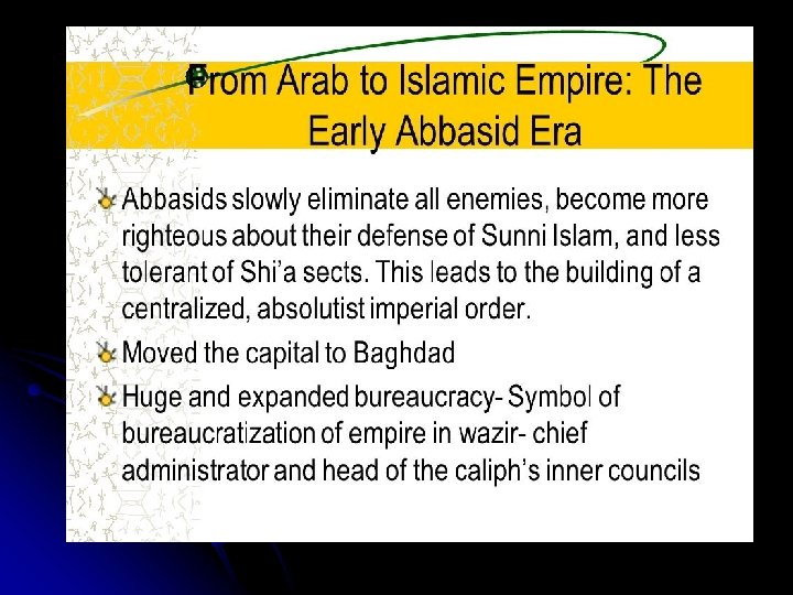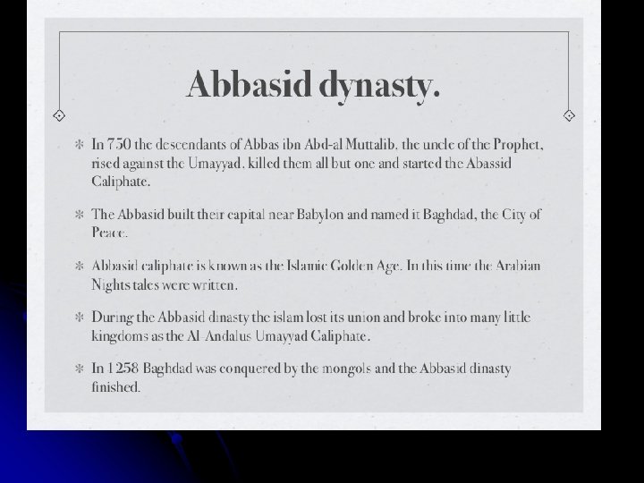 Banu Abbas Dynasty n Early Period Saffah, Mansoor, Mahdi, Haadi, Rashid, Al. Amin, Al-Ma’Moon n Late Period 1. Mu’tasim, Waathiq, Mu’tawakkil, Al-Munrasir, and 28 other rulers in succession. 1.