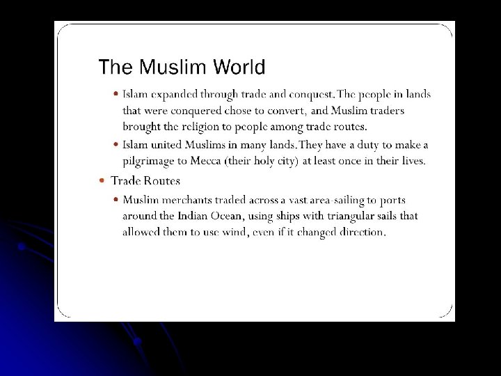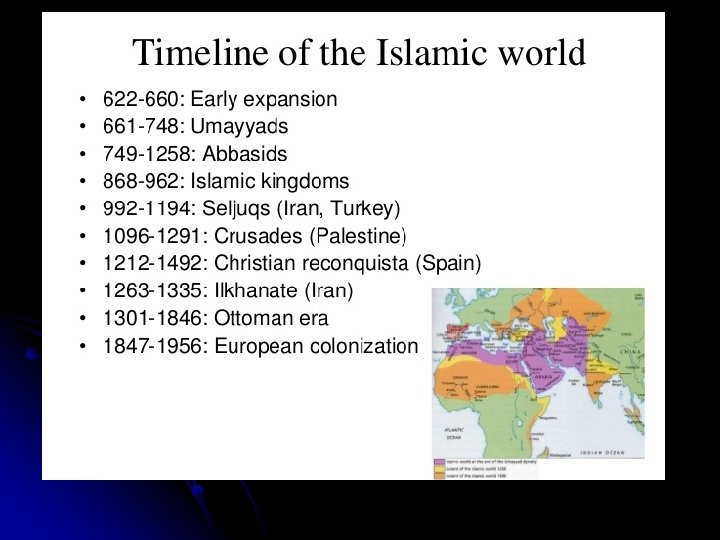 DECLINE: q DECLINE: By the 11 th century, however, the Arabs began losing their dominance in the Islamic world. Ø The Seljuk Turks conquered Syria, Palestine, and much of Persia. Ø In the 11 th and 12 th centuries, the Muslims lost Sicily and most of Spain to Christian knights. Ø In the 13 th and 14 th centuries, Mongols devastated Muslim lands. Ø In the 15 th century, the collapse of the Mongol empire left the way open for the Ottoman Turks, who reached their height in the 16 th century.