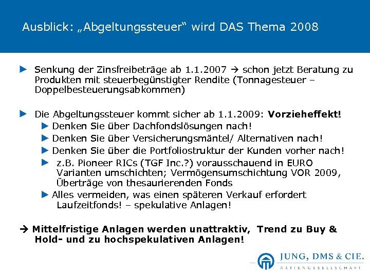 Ausblick: „Abgeltungssteuer“ wird DAS Thema 2008 Senkung der Zinsfreibeträge ab 1. 1. 2007 schon jetzt Beratung zu Produkten mit steuerbegünstigter Rendite (Tonnagesteuer – Doppelbesteuerungsabkommen) Die Abgeltungssteuer kommt sicher ab 1. 1. 2009: Vorzieheffekt! Denken Sie über Dachfondslösungen nach! Denken Sie über Versicherungsmäntel/ Alternativen nach! Denken Sie über die Portfoliostruktur der Kunden vorher nach! z. B. Pioneer RICs (TGF Inc. ? ) vorausschauend in EURO Varianten umschichten; Vermögensumschichtung VOR 2009, Überträge von thesaurierenden Fonds Alles vermeiden, was einen späteren Verkauf erfordert Laufzeitfonds! – spekulative Anlagen! Mittelfristige Anlagen werden unattraktiv, Trend zu Buy & Hold- und zu hochspekulativen Anlagen!