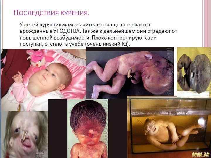 Беременность и курение Табачный дым содержит множество ядовитых веществ: никотин, синильную кислоту, угарный газ, вредные смолы, канцерогенные вещества. Все это через плаценту переходит к ребенку. Курение вызывает инфаркт миокарда, хронический бронхит, рак легких. Всем этим будущая мать может наградить своего ребенка. Кроме того нельзя чтобы кто- то другой курил рядом с беременной женщиной.
