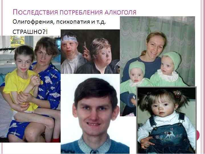 Беременность и алкоголь Потомство пьющих предрасположено к нервозам, психопатии, олигофренией и тд. При этом вовсе НЕ ОБЯЗАТЕЛЬНО быть хроническими алкоголиками. Последствия: пьянство родителей увеличивает вероятность того, что их дети вырастут алкоголиками. Детское место – плацента – еще не образовалась, а его уже отравляет алкоголь.