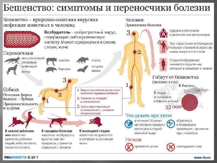Источником заражения являются инфицированные животные, заражение человека происходит при укусе или ослюнении животным поврежденной кожи или слизистой оболочки.