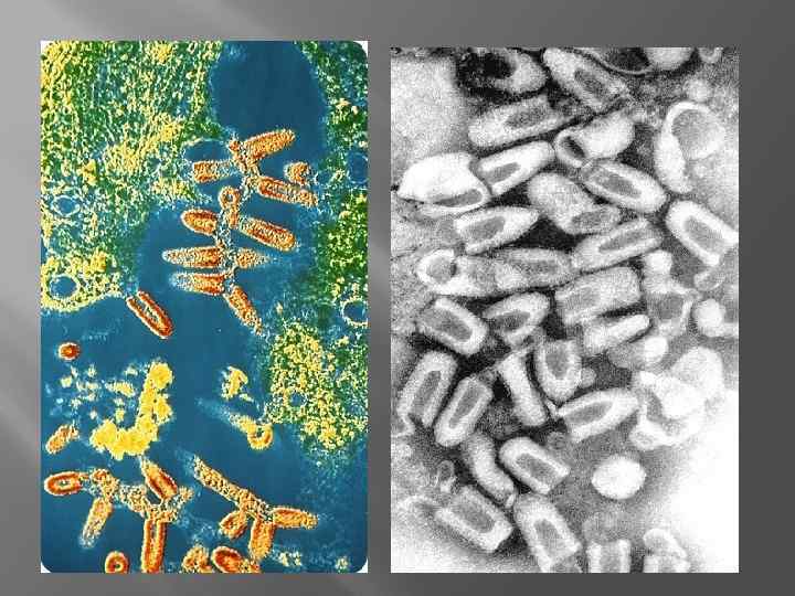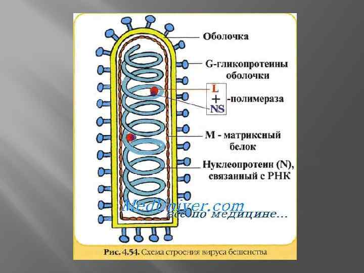 Характеристика возбудителя Морфология: - вирионы пулевидной формы; - длина 180 нм. ; - диаметр 75 нм. ; - содержит несегментированный «минус» РНК-геном; - нуклеоид спиральный, покрыт двойной двухслойной липидной оболочкой.