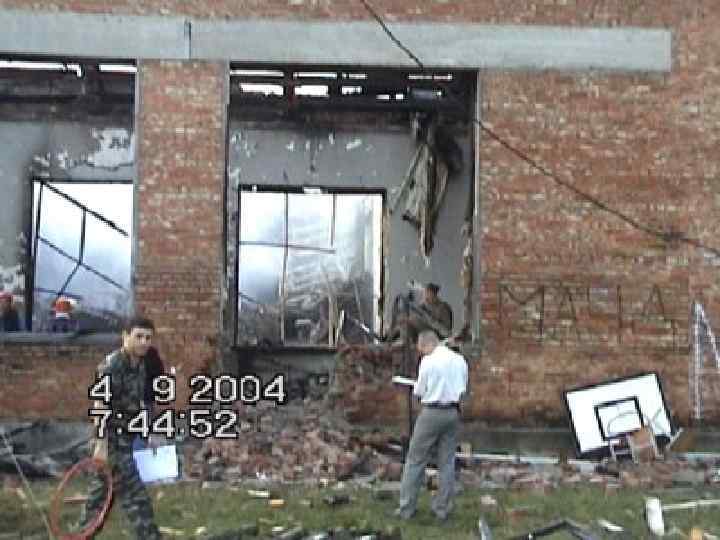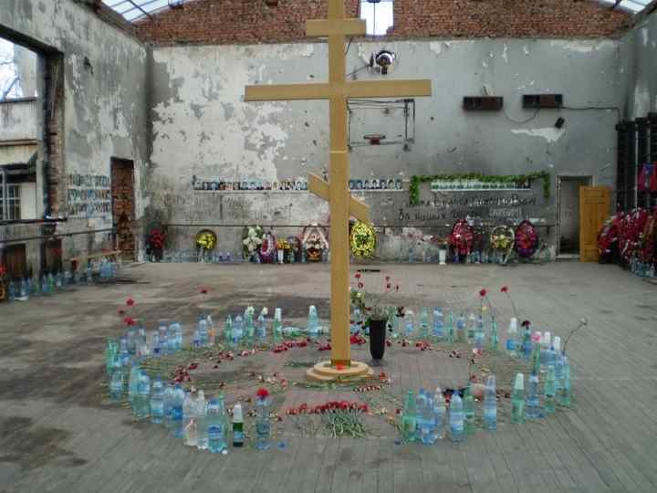 ИЗ ПРОТОКОЛА ОСМОТРА МЕСТА ПРОИСШЕСТВИЯ: “Спортивный зал школы № 1 города Беслана. На момент осмотра кровля отсутствует, деревянные балки обуглены. От покрытия пола, примерно на 40— 50 сантиметров, пластом находятся сотни обгоревших трупов детей, женщин и мужчин, занимающие около половины площади зала”.