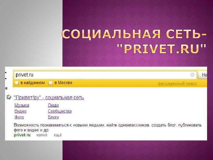Социальная сеть Привет. ру предлагает пользователям уникальные сервисы для поиска людей со схожими интересами, общения и развлечения. Главное отличие Привет. ру от других российских социальных сетей - это изначальная ориентация на объединение посетителей сервиса по интересам. При регистрации каждый пользователь указывает область своих интересов, и система автоматически подбирает интересные ему сообщества и собеседников.