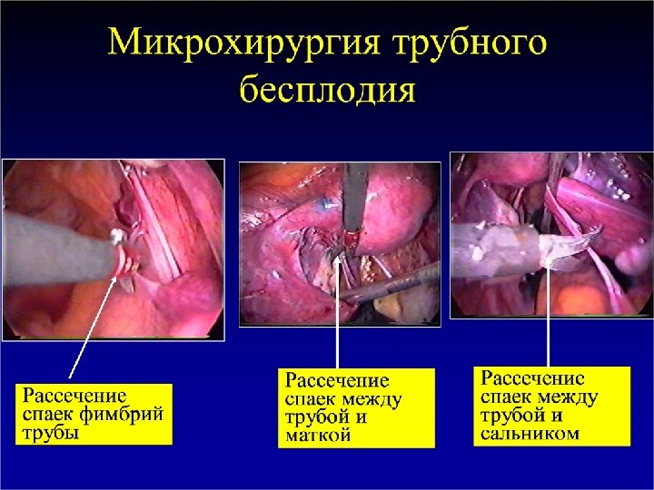 Хирургические методы лечения в браке • Лапароскопия, лапаротомия 1. Адгеолизис, фимбриопластика, неосальпинготомия 2. Коагуляция очагов эндометриоза 3. Миомэктомия 4. Цистэктомия, резекция или каутеризация яичников • Гистероскопия 1. Адгеолизис 2. Миомэктомия, полипэктомия 3. Коагуляция очагов эндометриоза 4. Трансцервикальная реканализация труб