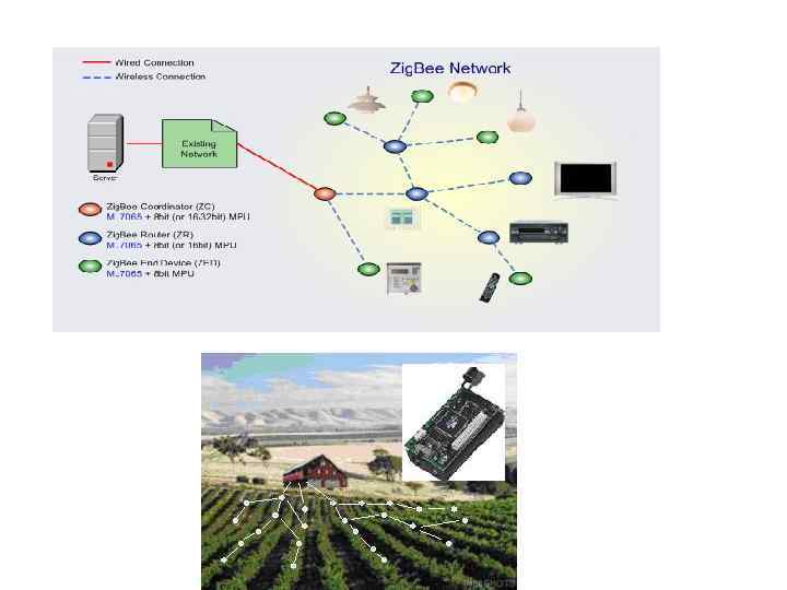 ТРИ КЛАССА УСТРОЙСТВ • • • Технология Zig. Bee/802. 15. 4 предоставляет разработчику несколько классов устройств: FFD-устройства маршрутизаторы (Full Function Device — устройство с полным набором функций), устройства-координаторы (Coordinators — FFD с дополнительными системными ресурсами в зависимости от сложности сети) RFD-оконечные устройства (Reduced Function Device — устройство с ограниченным набором функций). В каждой локальной сети Zig. Bee имеется только одно устройство-координатор. Основная задача координатора заключается в установке параметров и создании сети, выборе основного радиочастотного канала, в задании уникального сетевого идентификатора. При этом координатор является наиболее сложным из трех типов устройств, обладает наибольшим объемом памяти и повышенным энергопотреблением (питание от сети). Маршрутизаторы используются для расширения радиуса действия сети, поскольку способны выполнять функции ретрансляторов между устройствами, расположенными далеко друг от друга. Устройства поддерживают любую сетевую топологию Zig. Bee, могут выполнять функции координатора и обращаться ко всем узлам сети (FFD и RFD). Устройства с ограниченным набором функций не участвуют в маршрутизации, не могут выполнять функции координатора, обращаются только к координатору локальной сети (FFDустройству), поддерживают соединения типа «точка – точка» и «звезда» , играют роль оконечных сетевых узлов. На практике большинство узлов сети являются RFD-устройствами, а применение FFD-устройств и координаторов необходимо для образования мостов связи и соответствующей сетевой топологии.