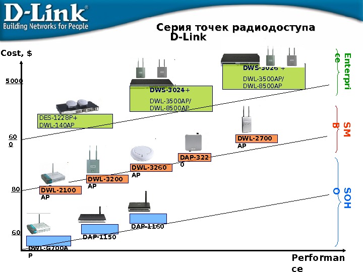 DWL-G 700 A P DAP-1150 DAP-11 6 0 Performan ce. Cost, $ DES-1228 P+ DWL-140 AP D W S- 3026 + DWL- 3500 AP/ DWL-8 500 AP D W S- 3024 + DWL- 3500 AP/ DWL-8 500 AP DWL-2 700 AP DWL- 3 2 6 0 AP DWL- 3 2 0 0 AP DWL-2 10 0 AP D AP — 3 2 2 0 S O H O S M B E n te rp ri ce 60 0 80 605000 Серия точек радиодоступа D-Link