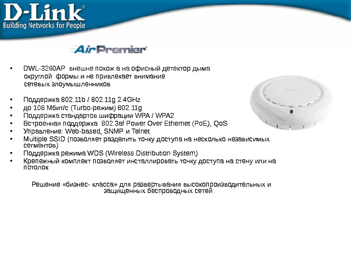 • DWL-3260 AP внешне похож а на офисный детектор дыма округлой формы и не привлекает внимание сетевых злоумышленников • Поддержка 802. 11 b / 802. 11 g 2. 4 GHz • до 108 Мбит/с ( Turbo- режим) 802. 11 g • Поддержка стандартов шифрации WPA / WPA 2 • Встроенная поддержка 802. 3 af Power Over Ethernet (Po. E), Qo. S • Управление: Web-based, SNMP и Telnet • Multiple SSID (позволяет разделить точку доступа на несколько независимых сегментов) • Поддержка режима WDS (Wireless Distribution System) • Крепежный комплект позволяет инсталлировать точку доступа на стену или на потолок Решение «бизнес- класса» для развертывания высокопроизводительных и защищенных беспроводных сетей