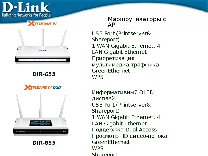 Маршрутизаторы с AP Информативный OLED дисплей USB Port (Printserver& Shareport) 1 WAN Gigabit Ethernet, 4 LAN Gigabit Ethernet Поддержка Dual Access Просмотр HD видео-потока Green. Ethernet WPS Shareport Домашний HI-ENDDIR — 855 DIR — 655 USB Port (Printserver& Shareport) 1 WAN Gigabit Ethernet, 4 LAN Gigabit Ethernet Приоретизация мультимедиа-траффика Green. Ethernet WPS