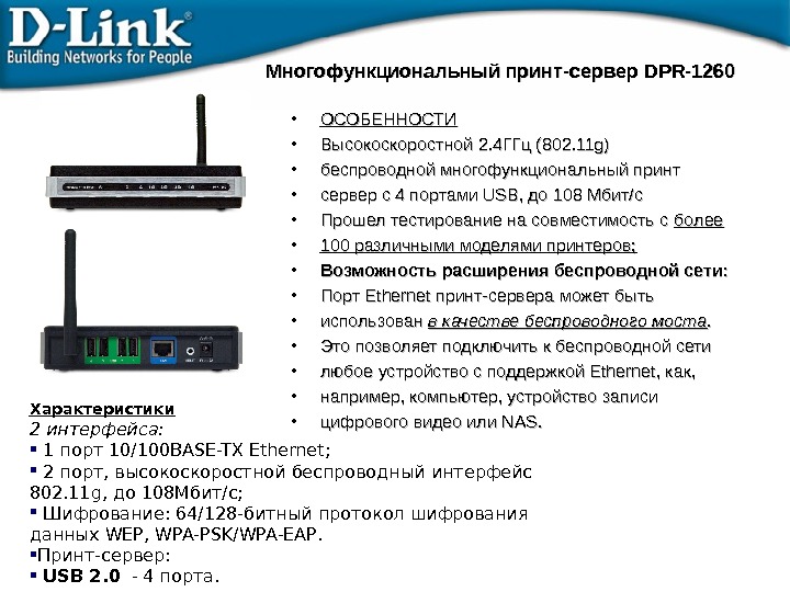 Многофункциональный принт-сервер DPR-1260 • ОСОБЕННОСТИ • Высокоскоростной 2. 4 ГГц (802. 11 g) • беспроводной многофункциональный принт • сервер с 4 портами USB, до 108 Мбит/с • Прошел тестирование на совместимость с более • 100 различными моделями принтеров; • Возможность расширения беспроводной сети: • Порт Ethernet принт-сервера может быть • использован в качестве беспроводного моста. . • Это позволяет подключить к беспроводной сети • любое устройство с поддержкой Ethernet, как, • например, компьютер, устройство записи • цифрового видео или NAS. Характеристики 2 интерфейса: 1 порт 10/100 BASE-TX Ethernet ; 2 порт, высокоскоростной беспроводный интерфейс 802. 11 g , до 108 Мбит/с; Шифр ование: 64/128 — битный протокол шифрования данных WEP , WPA-PSK/WPA-EAP. Принт-сервер : USB 2. 0 — 4 порта.