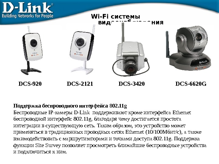 Wi-Fi системы видеонаблюдения DCS-920 DCS-2121 DCS-3420 DCS-6620 G Поддержка беспроводного интерфейса 802. 11 g Беспроводные IP- камеры D-Link поддерживают кроме интерфейса Ethernet беспроводной интерфейс 802. 11 g, благодаря чему достигается простота интеграции в существующую сеть. Таким образом, это устройство может применяться в традиционных проводных сетях Ethernet (10 / 100 Мбит/с), а также взаимодействовать с маршрутизаторами и точками доступа 802. 11 g. Поддержка функции Site Survey позволяет просмотреть ближайшие беспроводные устройства и подключиться к ним.