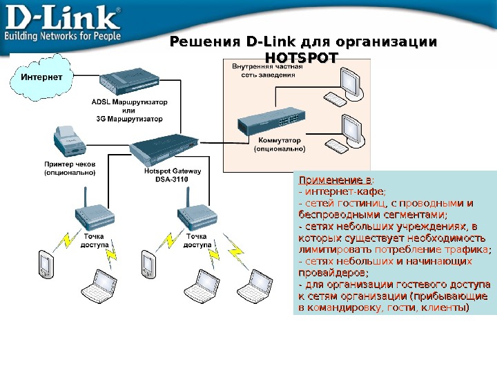Применение в : — интернет-кафе; — сетей гостиниц, с проводными и беспроводными сегментами; — сетях небольших учреждениях, в которых существует необходимость лимитировать потребление трафика; — сетях небольших и начинающих провайдеров; — для организации гостевого доступа к сетям организации (прибывающие в командировку, гости, клиенты)Решения D-Link длядля организации HOTSPOT
