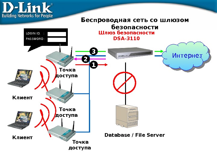 Database / File Server. LOGIN ID. : PASSWORD : Шлюз безопасности DSA-31 1 0 Интернет 13 2 Точка доступа Клиент Точка доступа Беспроводная сеть со шлюзом безопасности