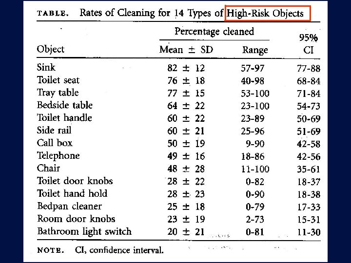 Thoroughness of Environmental Cleaning Carling et al. ECCMID, Milan, Italy, May 2011 >110, 000 Objects Mean = 32%