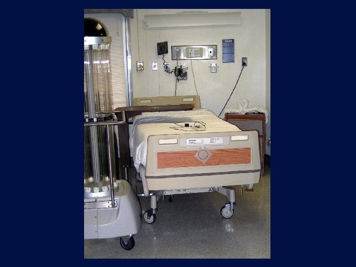 UV Room Decontamination Rutala, Gergen, Weber, ICHE. 2010: 31: 1025 -1029 • • • Fully automated, self calibrates, activated by handheld remote Room ventilation does not need to be modified Uses UV-C (254 nm range) to decontaminate surfaces Measures UV reflected from walls, ceilings, floors or other treated areas and calculates the operation total dosing/time to deliver the programmed lethal dose for pathogens. UV sensors determines and targets highly-shadowed areas to deliver measured dose of UV energy After UV dose delivered (36, 000µWs/cm 2 for spore, 12, 000µWs/cm 2 for bacteria), will power-down and audibly notify the operator
