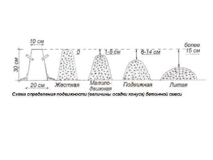 Классификация бетонных смесей по удобоукладываемости Марки по удобоукладываемос ти Ж 4 Ж 3 Ж 2 Ж 1 П 2 П 3 П 4 Норма удобоукладываемости по показателю Жесткости, с Подвижности, см 31 и более 21… 30 11… 20 5… 10 1… 4 4 и менее 5… 9 10… 15 16 и более