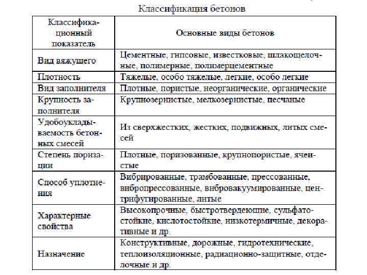 Бетоны классифицируются по следующим признакам: - основное назначение; - стойкость к видам коррозии; - вид вяжущего; - вид заполнителей; - структура; - условия твердения; - прочность; - темп набора прочности; - средняя плотность; - морозостойкость; - водонепроницаемость; - истираемость