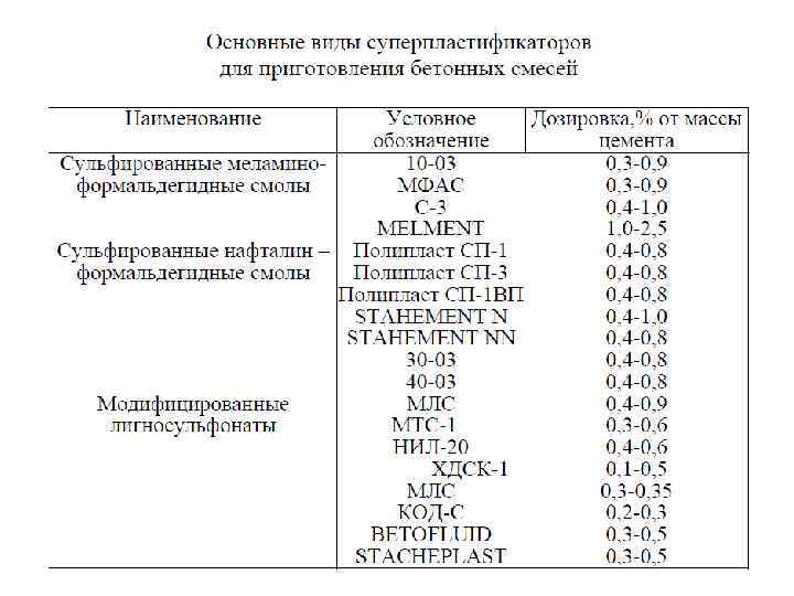 Суперпластификаторы (торговые марки) Суперпластификатор С-3 Один из первых отечественных суперпластификаторов на основе продукта конденсации нафталинсульфокислоты и формальдегида «Линамикс» Пластифицирующая добавка « Линамикс» является комплексным продуктом, состоящим из натриевых солей полиметиленнафталинсульфокислот с добавлением комплекса на основе лингосульфонатов. ДИСПЕРГАТОР НФ – продукт, получаемый сульфированием нафталина серной кислотой с последующей конденсацией с формальдегидом и нейтрализацией едким натром. ПОЛИПЛАСТ СП-1 ВП (ТУ 5870 -005 -58042865 -05) – добавка, относящаяся к пластифицирующему-водоредуцирующему виду – су- перпластификаторам. Представляет собой смесь натриевых солей по- лиметиленнафталинсульфокислот различной молекулярной массы с добавлением воздухоподавляющего компонента.