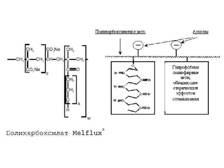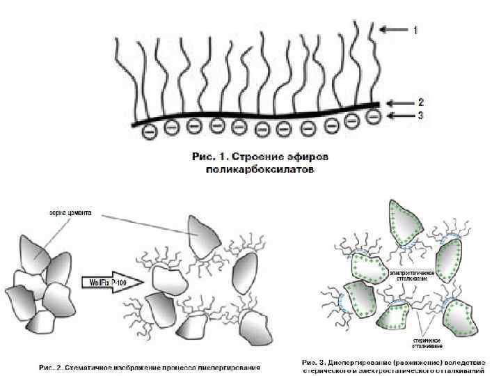 Гиперпластификаторы По строению они представляют собой привитые сополимеры. Механизм: взаимное отталкивание частиц и стабилизация суспензии за счет стерического эффекта. Для ГП характерно наличие поперечных связей и двух- или трехмерная форма. Поперечные звенья создают объемную защитную оболочку вокруг частиц твердой фазы, предотвращая слипание частиц и способствуя их взаимному отталкиванию. ГП отличаются от СП более сильным пластифицирующим эффектом (снижение водопотребности более чем на 30%)