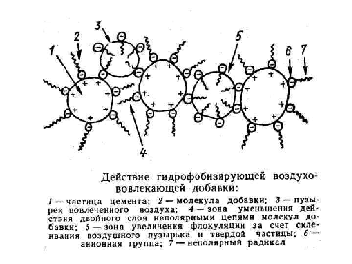Воздухововлекающие Механизм: При введении добавок этой группы в состав бетонной смеси с водой затворения происходит вовлечение в бетонную смесь при ее перемешивании значительного количества воздуха, который, равномерно распределяясь в бетонной смеси, создает систему замкнутых воздушных пузырьков, тем самым увеличивают объем цементного теста, что приводит к увеличению пластичности бетонной смеси. ВВД представляют собой длинноцепочечные молекулы с полярными группами на одном конце и неполярными на другом. Они концентрируются на поверхности раздела фаз воздух– жидкость с полярными группами в жидкости, а неполярными частями вне ее. Внутри поверхность пузырьков воздуха, таким образом, состоит из гидрофобного материала, образованного неполярными частями молекул, которые действуют как барьер проникновению в них воды и обеспечивают стабильность при перемешивании смеси и укладке.