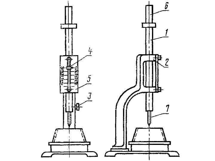 Жесткость (Ж, сек) определяют по времени вибрации, необходимого для выравнивания и уплотнения отформованного конуса из бетонной смеси на специальном приборе. а — прибор в исходном состоянии; б—после окончания вибрирования; 1 — виброплощадка; 2—цилиндр; 3 — конус с бетонной смесью; 4— диск с отверстиями; 5 — втулка; 6 — штанга; 7 — штатив