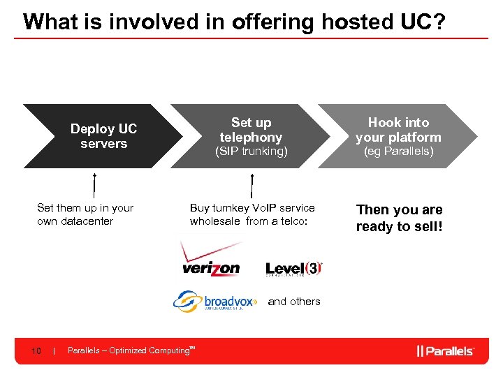 Why host UC? Hoster benefits $10 per barrel seat Not a commodity Very fast-growing but little competition (unlike plain old e-mail and collaboration products) 9 Parallels – Optimized Computing. TM High revenues and margins Charge up to $50 per seat per month – margins up to 50% Very, very sticky A company’s entire communications are hosted with you