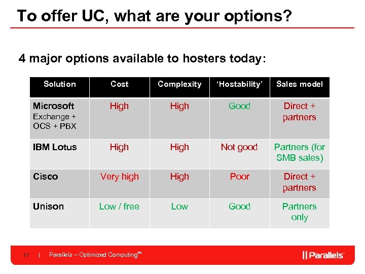What is involved in offering hosted UC? Set up telephony Hook into your platform Buy turnkey Vo. IP service wholesale from a telco: Then you are ready to sell! Deploy UC servers Set them up in your own datacenter (SIP trunking) and others 10 Parallels – Optimized Computing. TM (eg Parallels)